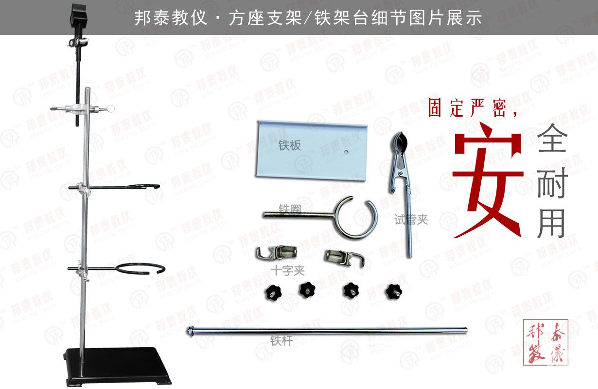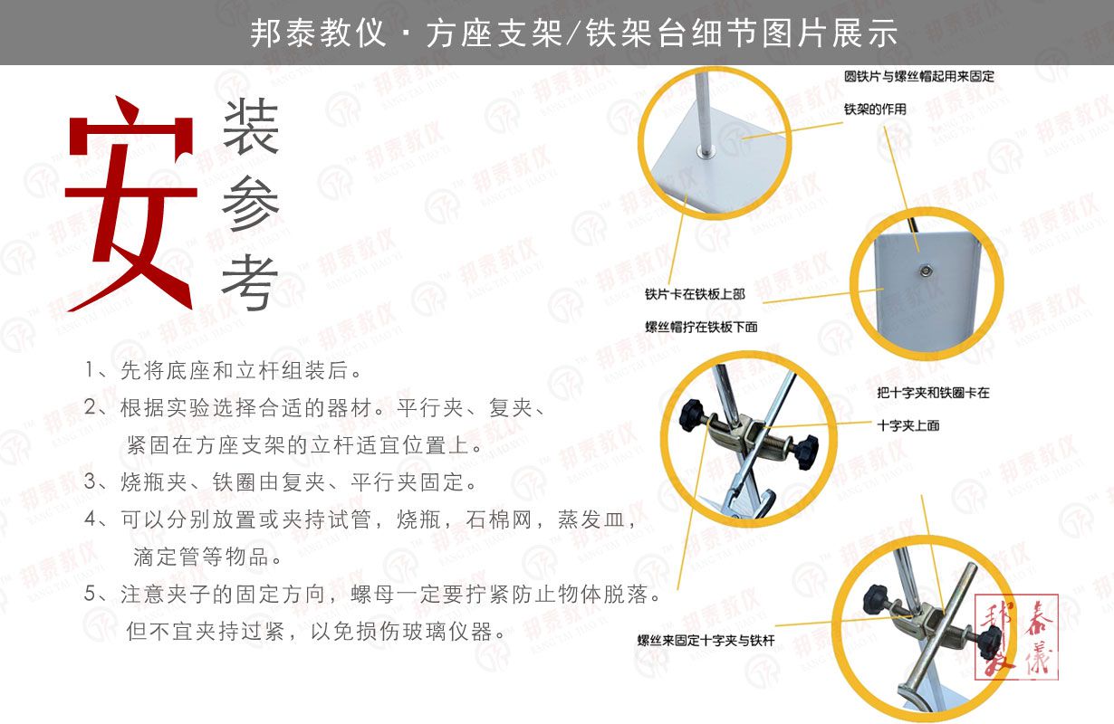 1、 方座支架,首先將底板方在平衡的桌上,將立柱裝在底板的前面孔上,根據(jù)實驗要求,調(diào)節(jié)鐵環(huán)、鐵夾于適當位置進行實驗。