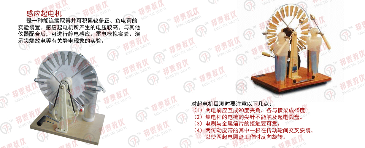 感應(yīng)起電機(jī),靜電起電機(jī),是一種能連續(xù)取得并可積累較多正、負(fù)電荷的實(shí)驗(yàn)裝置。感應(yīng)起電機(jī)所產(chǎn)生的電壓較高,與其他儀器配合后,可進(jìn)行靜電感應(yīng)、雷電模擬實(shí)驗(yàn)、演示尖端放電等有關(guān)靜電現(xiàn)象的實(shí)驗(yàn)。